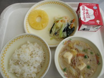 今日の献立は「マーボー白菜、はるさめサラダ、パイナップル」でした。