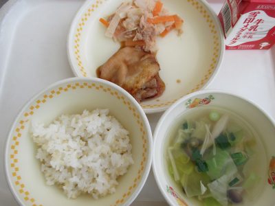 今日の献立は「鶏の照り焼き、大根とツナのサラダ、きのこのスープ」でした。