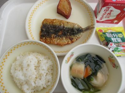 今日の献立は「いわしのかば焼き、大学芋、すまし汁、福豆」の節分献立でした。