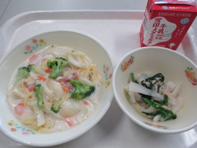 今日の献立は「クリームスパゲティ、大根とツナのサラダ」でした。