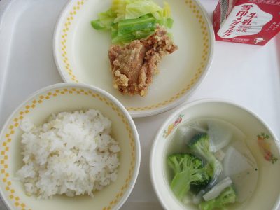今日の献立は「とりの竜田揚げ、キャベツのサラダ、ブロッコリーのスープ」でした。