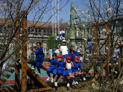 八池の杜のつり橋で遊ぶ2年生。