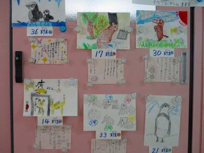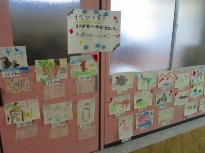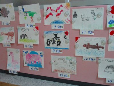 保健室前は、5月2日の「ウキウキウォーキング」で「れんげ班」全員が協力して描いた動物たちの絵があります。