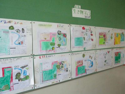 中央階段を上がった2階には、4年生が理科の時間に、はっちの杜で発見したことを「生き物マップ」にまとめています。