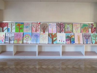 ギャラリーには、6年生の図工科作品「学校の木」が並んでいます。