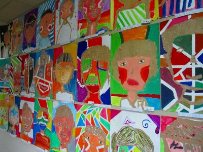 まず、造形室の前には、5年生が制作した「ガムテープ自画像」を展示しています。