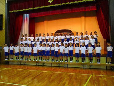 朝のねっこタイム、1年生3年生の合同合唱をしました。
