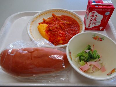今日の献立は「ミルクパン・ミートソース・プレーンオムレツ・ブロッコリーのサラダ」でした。