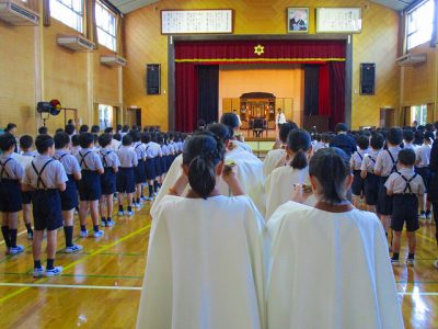校長先生の今回のお話は、前回の放送礼拝に引き続いて、いのししの「うりぼう」と、柴犬の「すみれ」、新登場のキツネ「コンコン」です。