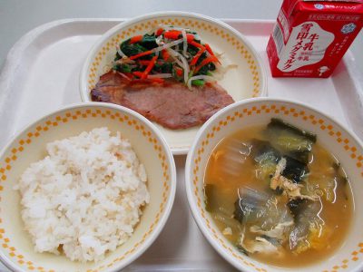 今日の献立は「豚の生姜焼き、ほうれん草のおかかあえ、白菜と卵のみそ汁」でした。