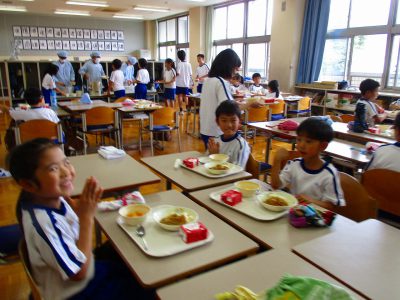 れんげ班のメンバーそろって給食を頂くのは、今日が最終日でした。みんなに大人気のカレーライス! 嬉しさ・楽しさ・おいしさ、どれも満点の一週間でした!写真は5年生教室です。わくわく・・・給食を待っている一コマです。