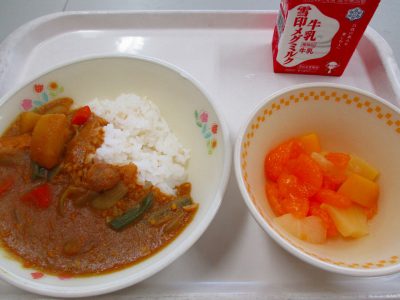 今日の献立は、「カレーライス・フルーツカクテル」でした。「今日のカレーーはピリッと辛いな」と感じる人も多かったようですが、返却されたカレーの食缶はほとんど空でした。蒸し暑く、ジメジメした日でしたが、しっかり食べてくれました。