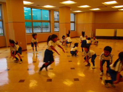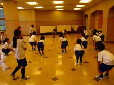 英語ヨガの時間。"Crouch down like a frog!"の指示で、まずはカエルのようにじっとします。