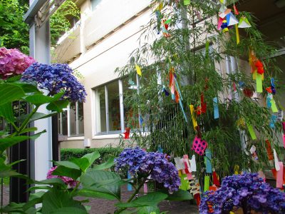 校門前では正面に勢至丸様、左にあじさい、右に七夕かざりと、華やかで素敵です。