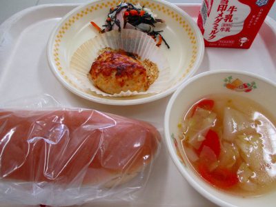 今日の献立は「黒糖パン、とりのコンベクション焼き、ひじきのサラダ、トマトのスープ」です。