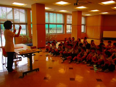 歯科衛生士さんをゲストティーチャーにお迎えして、歯磨き指導がありました。