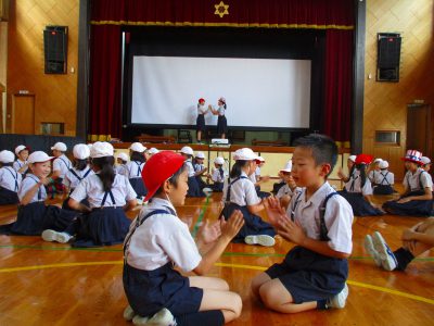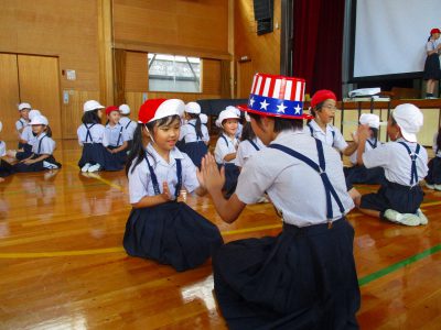 たくさんの英語表現を練習した後、今日は、[Pat a cake]の歌に合わせて手遊び。