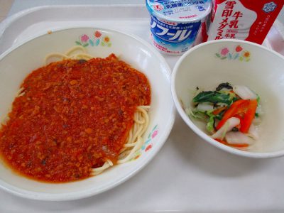 今日の献立は「ミートソーススパゲッティ・海苔のサラダ・ソフール」です。