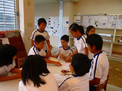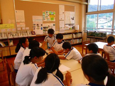 写真は、中間休みに、各組のキャラクターやスローガン、応援合戦の内容などを話し合っているところです。