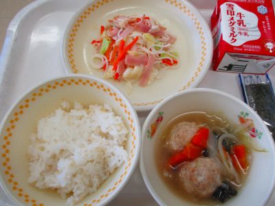 献立は「キャベツと肉団子のスープ、米粉スパゲティサラダ、味付けのり」でした。