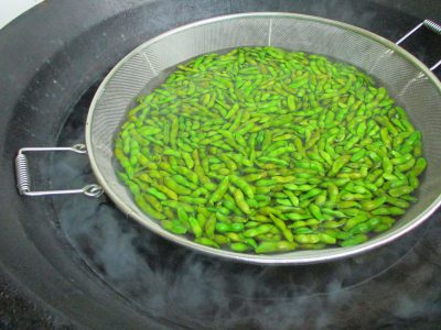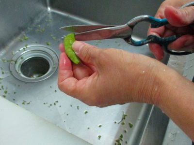 下処理として、少量の食塩でも豆に塩味が入りやすいように、さやの両端をはさみでひとつずつ落としました。