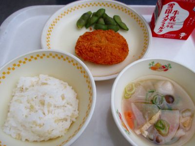 今日の献立は「牛肉コロッケ、紫ずきんの塩ゆで、けんちん汁」です。