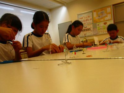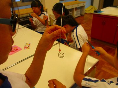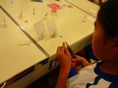 造形室からゆずっていただいたアルミタイプのやわらか針金を使用しています。急カーブには、ラジオペンチが役立ちます。ビーズを付けて自分だけの“カード立て”の完成です。