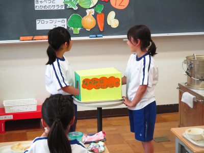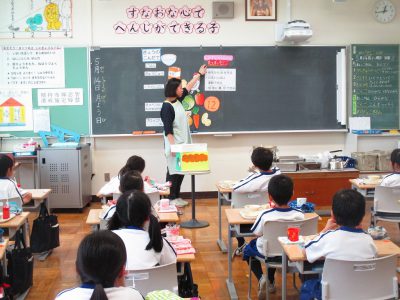 今日の給食の時間は、栄養士の先生から、給食の食材についてのお話を聞きました。