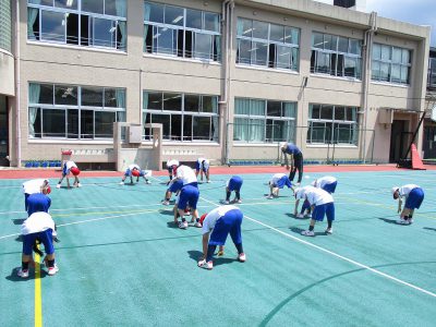 今日も日直さんが前に出て、準備体操を進めています。