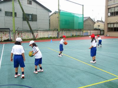 ボールつきのテストに向けて、ペアで練習をしています。