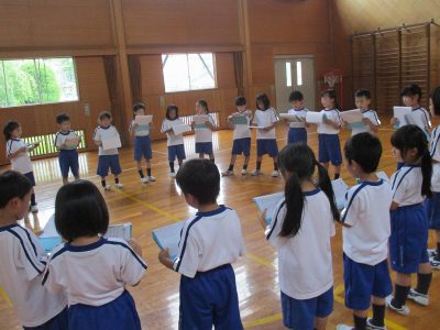 体育館では「あいうえおであそぼう!」の1年キッズバージョンをみんなで読みました。