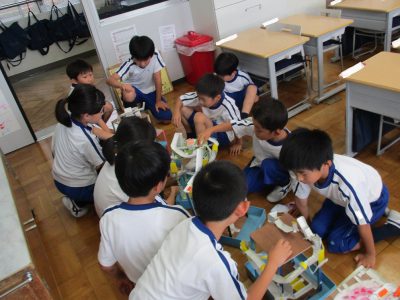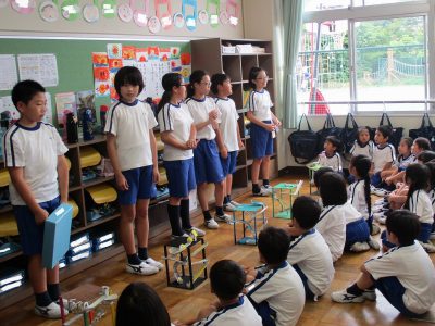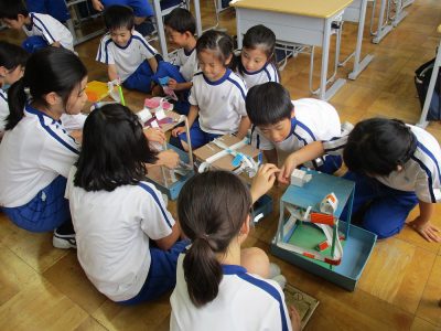 昨日に続き、今日も5年生が「ビー玉コースターの体験会」を開いてくれました。