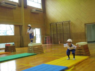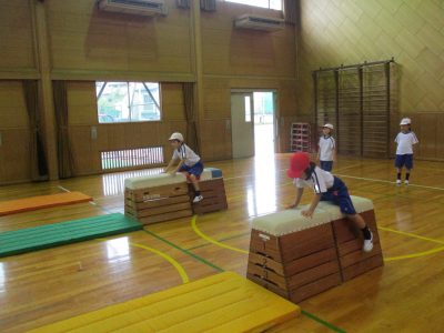 「跳び箱遊び」の学習では、ひざをうまく使って着地する練習の後、発表会を行いました。ジャンプの仕方を工夫して、上手に着地することができました。