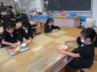 肌の色は、赤・白・黄の3色の絵の具を自分で混ぜて合わせて作ります。
