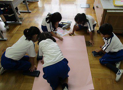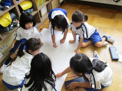 赤組も白組も、模造紙にキャラクターを大きく描くのに苦戦しながらも、積極的にがんばっています!