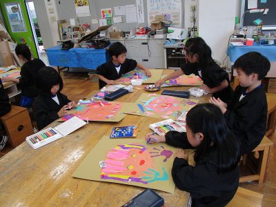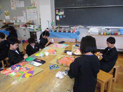 折り紙をちぎって貼ったり、クーピーで描いたりしながら、カラフルな作品ができました。