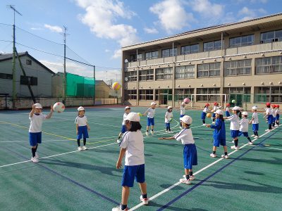 前回に引き続き、ペアのお友達がキャッチしやすいように投げる練習をしています。