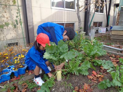 「朝根っこタイム」の時間に、6年生と大根引きをしました。