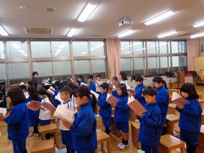 「法然上人頌」の練習では、聖歌集をしっかりと見ながら、音の高さに気をつけて歌いました。