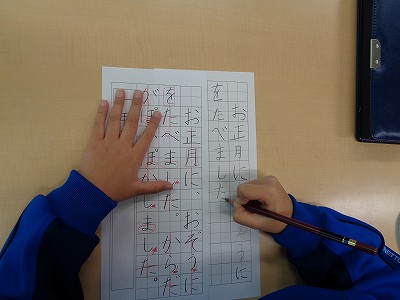 お手本には、これまでに学習したポイントを赤鉛筆で書き込んでいます。
