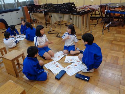今日は、ケーキにのせるフルーツをチーム毎に考え、リズムに合わせて歌えるように練習しました。