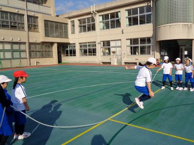 大縄跳びでは、縄の動きをよく見て、3回跳んで抜ける練習をしました。