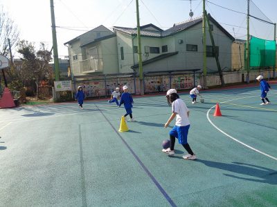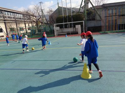 ボール蹴り運動では、コーンを狙って蹴る練習をしました。