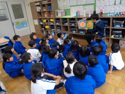 野菜や果物のリアルな表情に、"(She is) happy!" "(He is) grumpy!"と、声を合わせて、本の世界に入っていました! 読み聞かせで、先生と子ども達で、笑いと英語のコミュニケーションがありました!