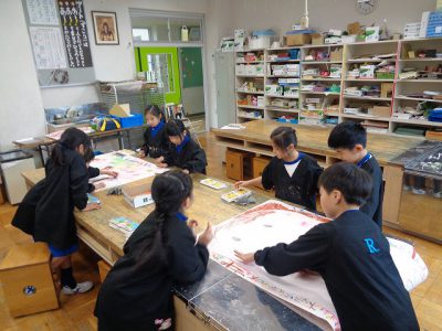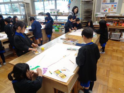 チーム毎に、「どんな木にするのか」「何を描くのか」「切り紙をどこに貼るのか」を相談して、楽しい作品に仕上げていました。