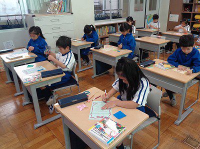 6年生の班長さんに喜んでもらえるように、丁寧に文字を書いて、切り紙やカラーペンで飾り付けをして仕上げました。