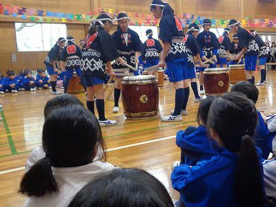 会の最後には、6年生の和太鼓の発表があり、1年生のみんなは、その迫力に驚きながらも、6年生の姿を憧れの眼差しで見つめていました。