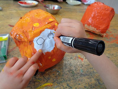 色を塗った後は、油性マジックで、顔や模様を描きました。