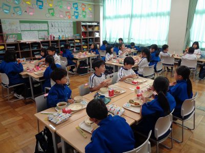 いつもはチーム毎に給食の時間を過ごしていますが、今日はお楽しみ会の係毎に給食をいただきました。