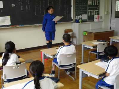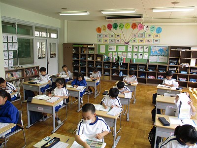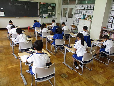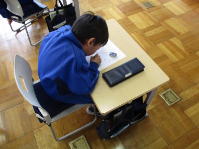 昼根っ子では、チャイムが鳴り終わる前に、全員が着席して、計算ドリルの問題を解いています。